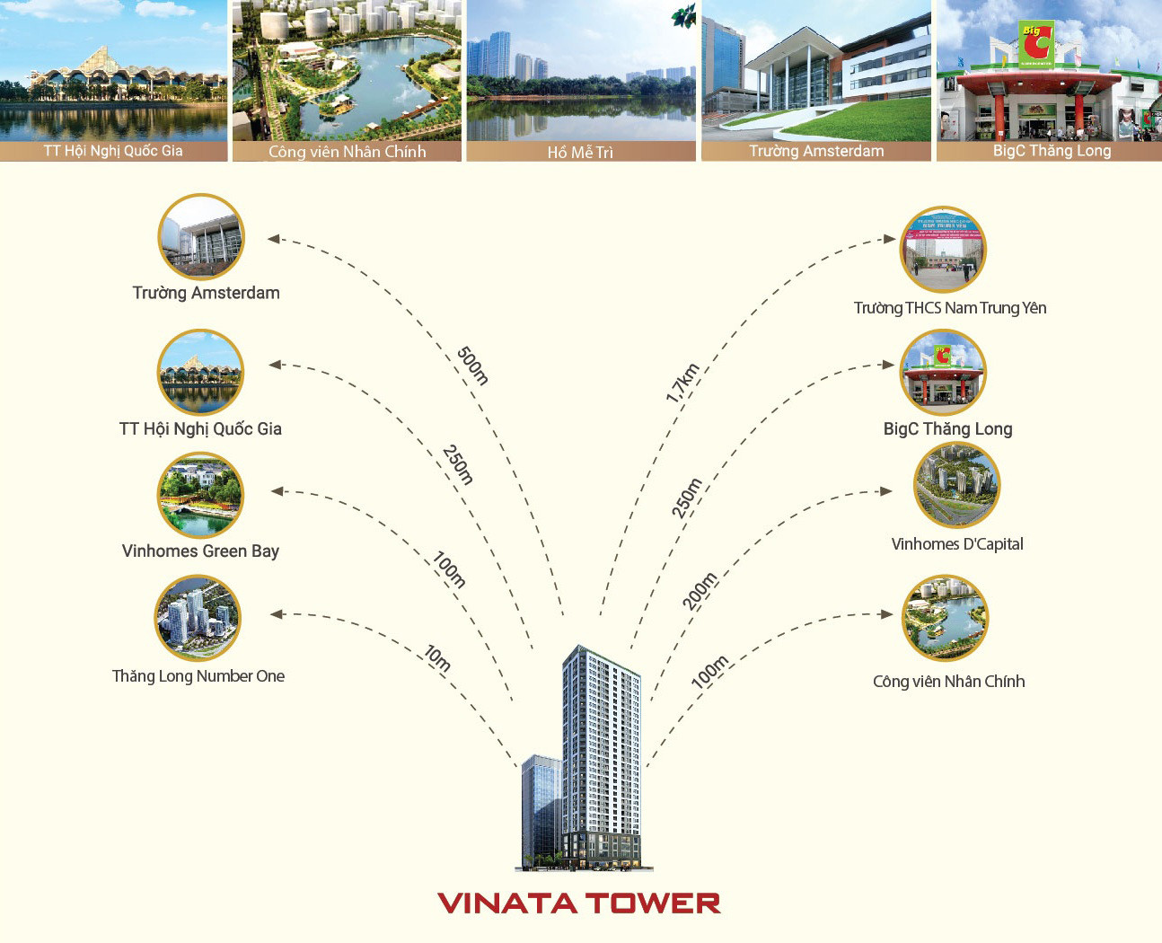 - Cư dân sống tại Vinata Tower sẽ dễ dàng liên kết với các trung tâm phát triển khác của Thủ đô Hà Nội qua các tuyến đường huyết mạch như: đường vành đai 3, đại lộ Thăng Long, Trần Duy Hưng, Lê Văn Lương,…
